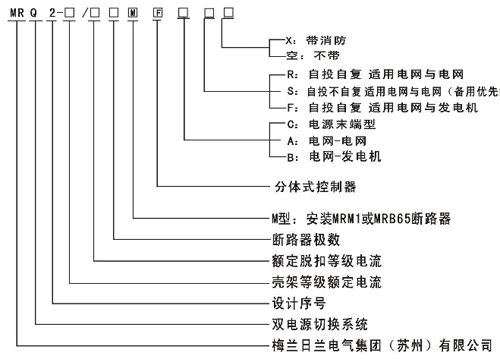 用戶(hù)在訂貨時(shí)應(yīng)按第4項(xiàng)的型號(hào)及含義注明智能系統(tǒng)的型號(hào),規(guī)格斷路器框架電流、極數(shù)、額定脫扣電流、功能、切換方式。 例如:MRQ2-100/63/4M/B/R智能雙電源自動(dòng)切換系統(tǒng),塑殼斷路器殼架電流為100A,額定脫扣電流為63A,四級(jí)、電網(wǎng)對(duì)發(fā)電、自投自復(fù)。